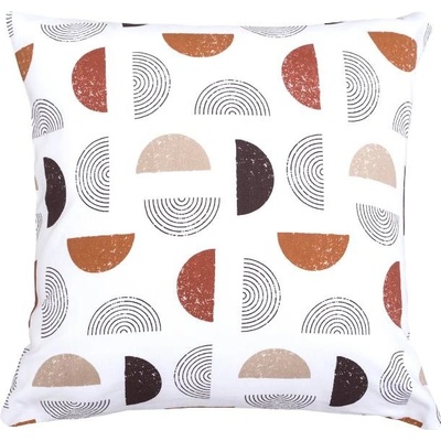 Moderní světlý povlak na dekorační polštářek s geometricky pojatým motivem. Nadčasové kružnice a spirálky v hnědorezavé kombinaci na bílém pozadí se stane ozdobou Vašeho bytu....