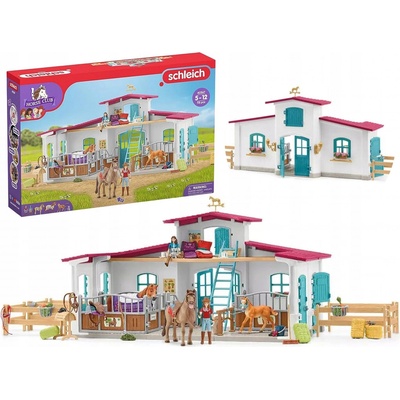 Set figurek a příslušenství Schleich Venkovský dům a stáj u jezera 42706 je ideální pro malé milovníky koní od 5 let. Tento set obsahuje vše, co je potřeba pro péči o koně, od stáje s uzdami a sedly připravenými na vyjížďky až po kbelík, kartáč a vodní hadici pro péči...