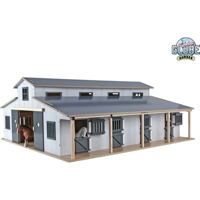Dřevěná stáj (bez dekorací a figurek) vhodná pro koně značky Schleich. Rozměr: 72,5x38x60cm (1:24). Věk: 3+.