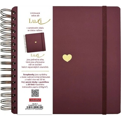 Limitovaná edice scrapbooků se sametovým přebalem v moderní bordó barvě a se zlatým motivem Srdce. Luxi jsou jedinečná alba s krémovým papírem, kroužkovou vazbou a s gumičkou...