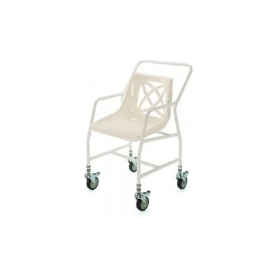 Pojízdná židle do sprchy. Přednosti plastové sedátko s opěrkou zad pevné područky kolečka s nášlapnou brzdou Parametry Celková výška berle: 83 cm Celková šířka: 55 cm...