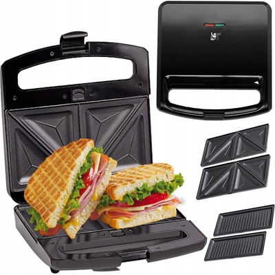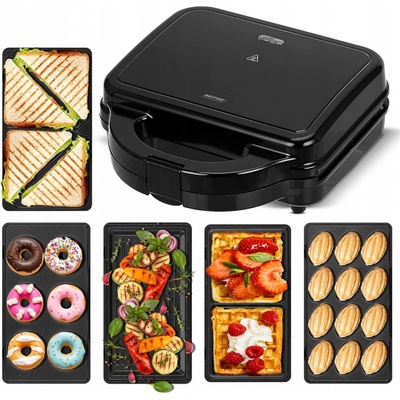 Sendvičovač s výměnnými deskami na trojúhelníkové sendviče, klasické vafle, vaflové tyčinky, formou na donuty a formou na dětské piškoty různých tvarů. Nepřilnavý povrch.