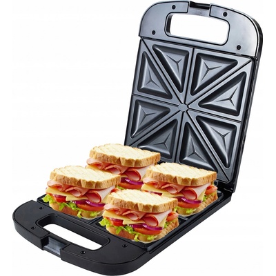 Kvalitní sendvičovač s nepřilnavými plotnami pro dva sendviče trojúhelníkového tvaru vybavený tepelně izolovanou rukojetí.