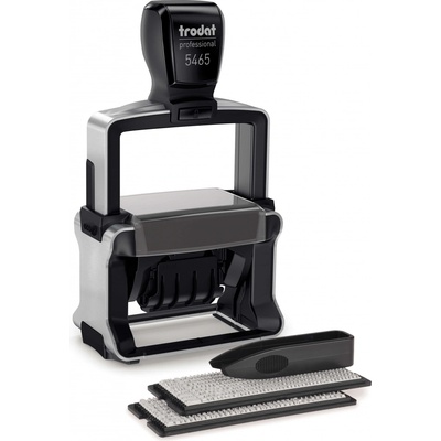 Kovové samobarvicí razítko typu "sestavte si sami" s datumem. Pokud nepotřebujete text často měnit, hezčí otisk bude mít razítko s klasickým štočkem vyrobeným dle Vašeho přání...
