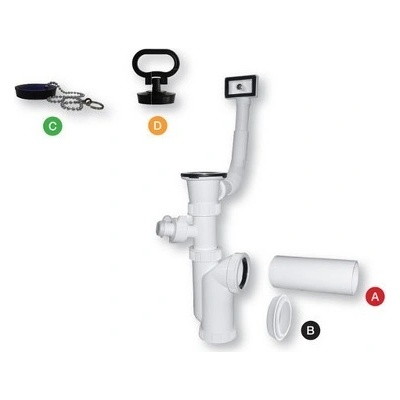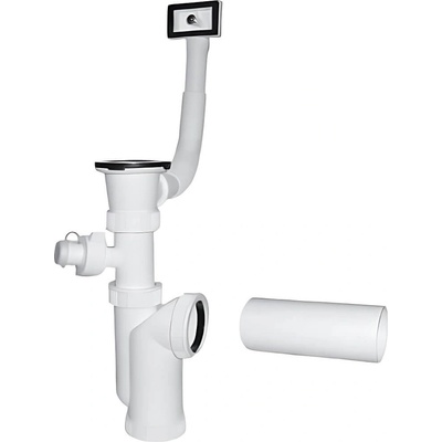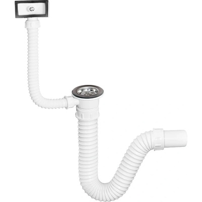Dřezový sifon s pračkovým vývodem, univerzálním přepadem a zátkou s řetízkem.