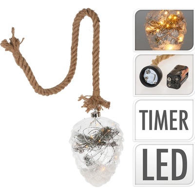 Šiška skleněná zavěšená na jutovém provazu. - 15 mikro LED (teplá bílá) délka provazu je 65 cm zelená halenka uvnitř časovač: svítí 6 hod. / nesvítí 18 hod. Baterie: 3x AA...