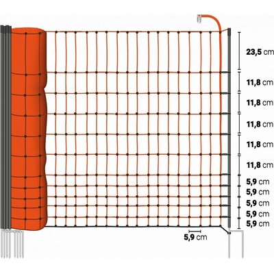 Vodivá síť pro drůbež KERBL 292271 106 cm x 50 m / 2 hroty, oranžová Ohradníková vodivá síť pro drůbež, výška sítě 106 cm, délka sítě 50 m, 15 plastových tyček s dvojitým...