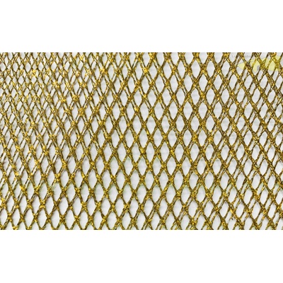 Tato zlatá síťovina s leskem má oka o velikost kosočtverců 0,5 x 0,5cm. Je vhodná na společenské doplňky, šaty apod. Lze použít na dekorační účely.