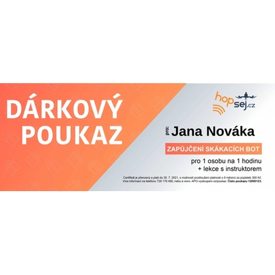 Zážitek na skákacích botách A-Jump pro jednu osobu na jednu hodinu. V případě zájmu však není problém vytvořit dárkový poukaz na delší dobu. Stačí napsat Váš individuální...