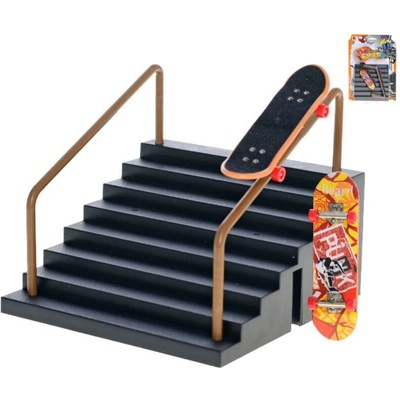 Dětský prstový skateboard, fingerboard prkno z kovu a plastu, v sadě se skate rampou v provedení jako schodiště se zábradlím. Slouží k procvičení jemné motoriky prstů....