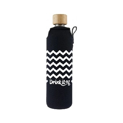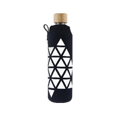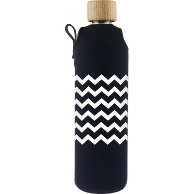 skleněná lahev 330ml z borosilikátového skla s dřevěným uzávěrem a motivem cikcak pruhů , uložená v neoprenovém obalu zabraňujícím rozbití a udržujícím nápoje...