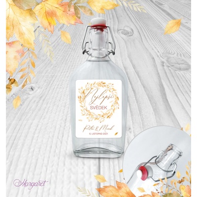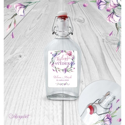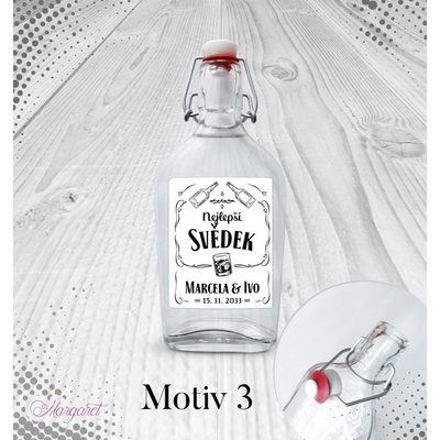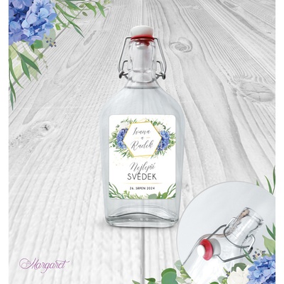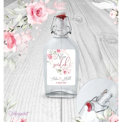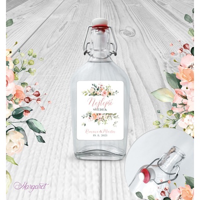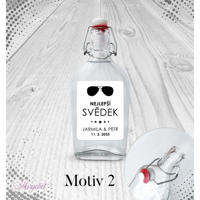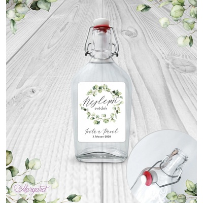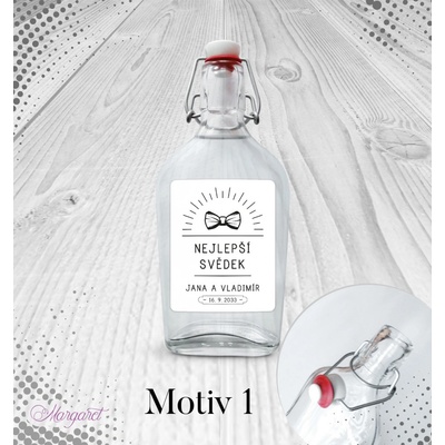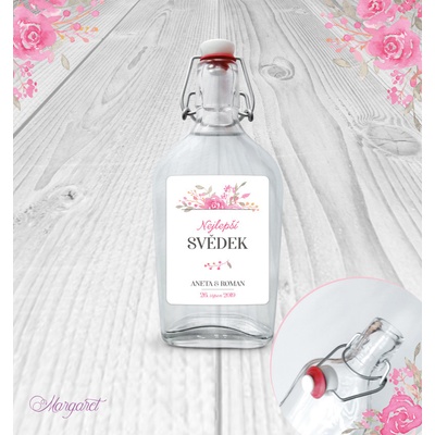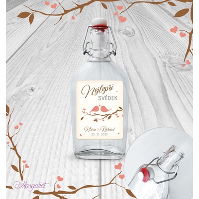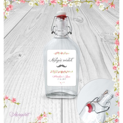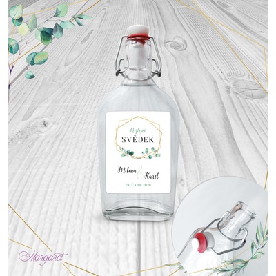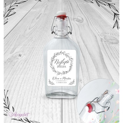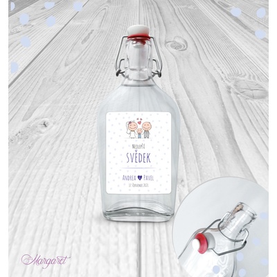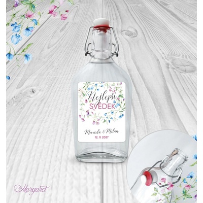 Krásný dárek pro svědka. S vašimi jmény, datem svatby a nápisem “Nejlepší svědek”. Skleněná láhev s pákovým uzávěrem, etiketa na samolepícím papíře s vyšší gramáží. Po...