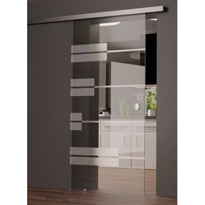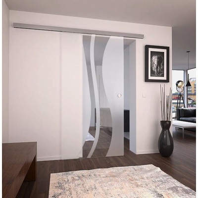 Designové posuvné skleněné dveře s jemným gravírovaným motivem, které propůjčí obýváku moderní a vzdušný vzhled.
