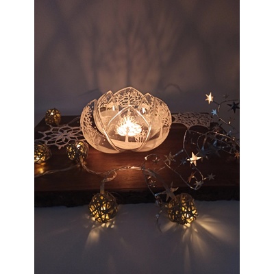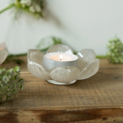 Skleněný svícen ruční výroby ve tvaru lotosu, vhodný na čajovou svíčku. Každý kus je originál.