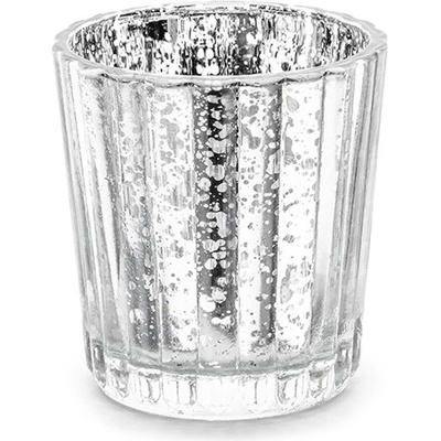 Svícen skleněný stříbrný Stojan na svíčku je výšky cca 6 cm a šířky cca 5,5 cm Cena za 1 ks Hezký doplněk na párty ve stříbrné barvě.