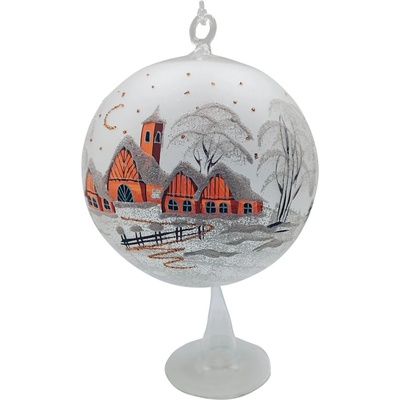 Skleněný lampion na svíčku ručně malovaný s motivem zasněženého kostelíka a chaloupek, průměr 15 cm. Vhodný na čajovou svíčku.