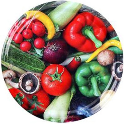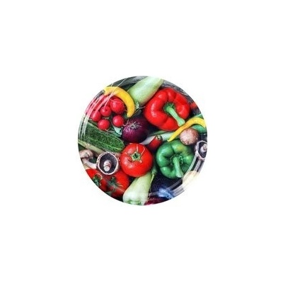 \nVíčko na šroubovací zavařovací sklenice. Pouze do 100°C. Motiv zelenina. Materiál - hliník. Balení 10 ks. Průměr 8,2 cm.\n