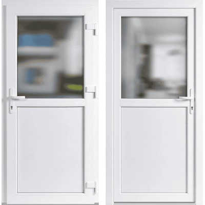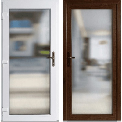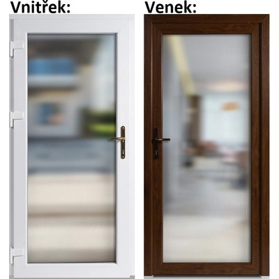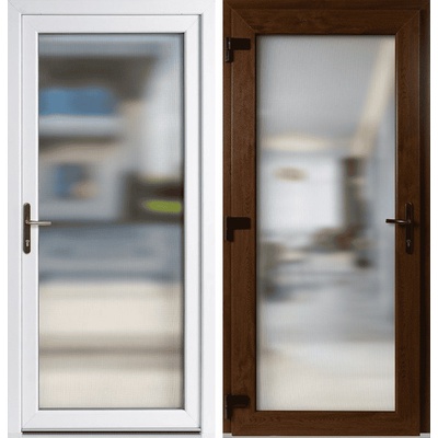 Skladem – jednokřídlé vchodové plastové dveře Celoprosklené (3/3 sklo crepi) s izolačním dvojsklem čirým 32mm v rozměru 88x198 cm (rozměr i se zárubní) se otevírají ven a jsou...