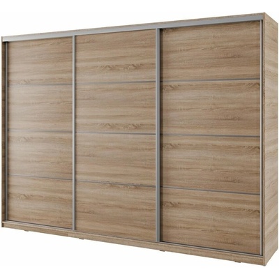 Šatní skříň 280, dub sonoma. Šatní skříň s posuvnými dveřmi v moderním provedení. Nezvyklá výška 220 cm a šířka 280 cm Vám nabídne opravdu velký úložný prostor. Korpus i dveře jsou z kvalitní LTD desky síly 16 mm, obsahuje hrany ABS. Skříň má aluminiové kování a lišty,...