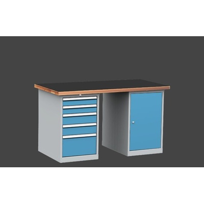 Montovaný dílenský stůl 1500 s bukovou spárovkou 40 mm a hladkou pogumovanou pracovní plochou 4 mm, 5-ti zásuvkový kontejner a skříňka montovaný dílenský stůlbuková spárovka 40...