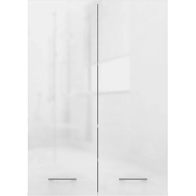 Elegantní bílá skříňka do koupelny se zavřeným úložným prostorem a třemi poličkami. Skříňka se zavěšuje na zeď. Sestava je doplněná o skříňku na schování pračky nebo...