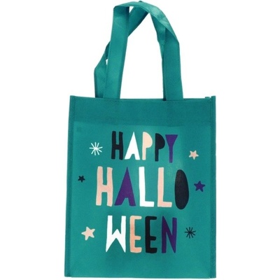 Látková taška, která je vhodná na halloweenskou výslužku Taška je tyrkysové barvy s oboustranným potiskem Happy Halloween Její rozměr je 21 x 23 cm