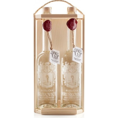 Dárková sada slivovice 0,5L + hruškovice 0,5L v dřevěné krabičce. Obsah alkoholu 50%.