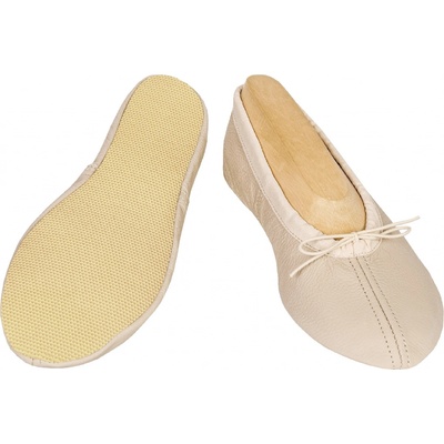 Cvičky v provedení z kůže. Po obvodu je gumička na stažení vedená tunýlkem. Protiskluzová podešev z pryže.