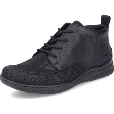 Dámské kotníkové boty značky Rieker se šněrováním. Díky pohodlné platformě jsou ideální ke každodennímu nošení. Boty mají hladká černý vzor s černým prošíváním na špičce....