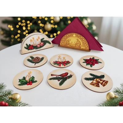 Vánoční dřevěná sada na stůl Poctivá česká výroba – od návrhu až po hotový výrobek Tento set obsahuje stojánek na ubrousky (6,5x13cm), stojánek na podtácky (6,5x13cm) a 6...