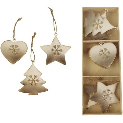 Dekorace k zavěšení. Rozměry: 6,5 x 1 x 7,5 cm. Materiál: kov. Barva: zlatá. Tento výrobek není hračka. Určeno do vnitřních prostor.