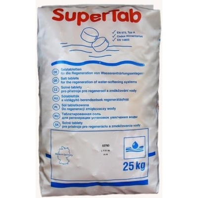 Tabletová sůl Supertab 25kg - Regenerační pro úpravny vody Solné tablety SuperTabs poskytují optimální vlastnosti pro použití v přístrojích pro regeneraci a změkčování vody fungujících na bázi iontové výměny. Forma, hutnost a čistota solných tablet SuperTabs perfektně...