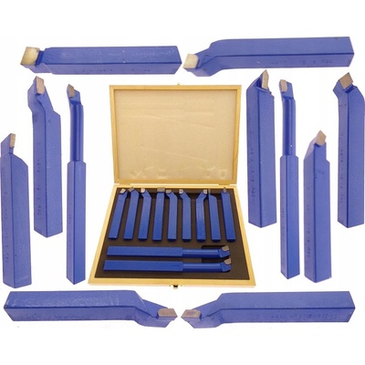Sada nožů na soustružení. Jedenáct dílů a přenosný kufr. Splňující řadu nejpřísnějších norem DIN. Rozměry nožů jsou 8x8 mm.