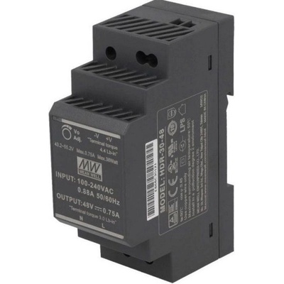 Zdroj Mean Well HDR-30-48, 48V=/36W spínaný na DIN lištu **Technické parametry:** Vstup: 100–240V/0,48A max Výstup: 48V/36W /0,75A při 48V (výstup: 43,2-55,2V, lze regulovat...