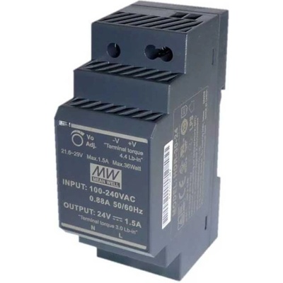 Zdroj Mean Well HDR-30-24, 24V=/36W spínaný na DIN lištu **Technické parametry:**Vstup: 100–240V/0,48A maxVýstup: 24V/36W /1,5A při 24V (výstup: 4,5-5,5V,...