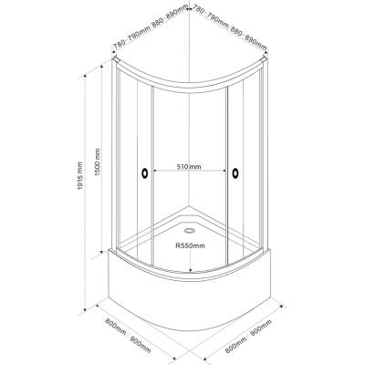 - rozměry: 90 x 90 cm - instalační rozměr: 88-90 cm - výška: 165 cm - poloměr: 550 mm - šířka vstupu: 550 mm: 550 cm: 54 cm - 6 mm čiré sklo - povrchová úprava Antidrop pro...