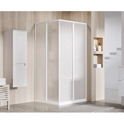Čtyřdílný čtvrtkruhový sprchový kout Supernova v provedení matný chrom a s výplní z neprůhledného plastu s dekorem Pearl. Posuvný systém otevírání. - rozměr: 90x90 cm -...