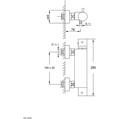 Sprchová termostatická nástěnná baterie, chrom (100 3200) - regulace teploty a objemu - ochrana proti zpětnému toku - rozteč 150 mm - připojení 1/2" - 16,2 l/ min - 3 bar...