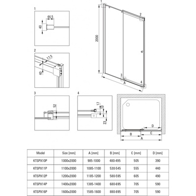 Detailní informace o produktu: Výška 1950 mm Šířka 980 - 1000 mm Šířka vstupu 400 mm Šířka pevného segmentu 458 - 478 mm Posuvné dveře s leštěným hliníkovým profilem (lištou)...