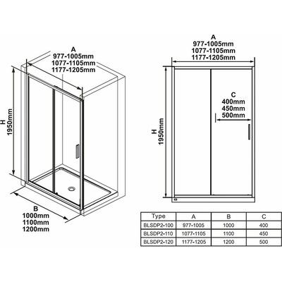 Sprchové dveře posuvné dvoudílné, v rozměrech 100, 110, 120 cm: provedení rámu: lesk, černá, výplň z bezpečnostního skla: transparent, výška výrobku 1950 mm "rozměry: 100, 110,...