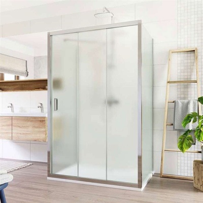 Hliníkové profily v barvě chrom, sklo Čiré, síla skla 6/6 mm, obdélník, rozměr 900x1200 mm, výška 2000 mm, vstup rohem.