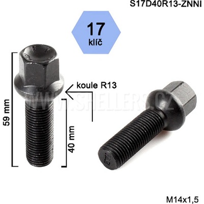 Kolový šroub S17D40R13-ZNNI pro originalní litá ALU i plechová kola značek Audi, Seat, Škoda, Bentley a Volkswagen prodloužený o 13 mm. Celková výška 59 mm. Barva...