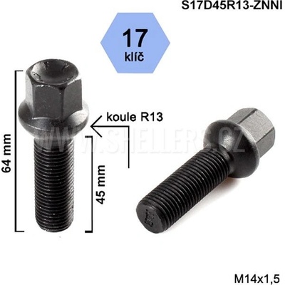 Kolový šroub S17D45R13-ZNNI pro originalní litá ALU i plechová kola značek Audi, Seat, Škoda, Bentley a Volkswagen prodloužený o 18 mm. Celková výška 64 mm. Barva...