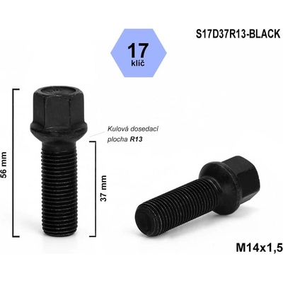 Kolové šrouby S17D37R13-ZNNI pro originalní litá i plechová kola Audi, Seat, Škoda, Bentley a Volkswagen (všechny modely v pětišroubovém provedení) prodloužený o 10 mm pro...