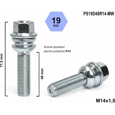 Šroub na kola M14x1,5×48 mm s kulovou pohyblivou dosedací plochou R14 typ PS19D48R14-MW pro značky automobilu Porsche, VW Touareg, VW Amarok a Audi Q7 prodloužené o 12 mm pro...