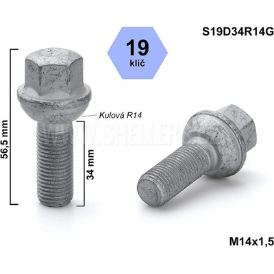 Šroub originální pro litá i plechová kola LS19D34FR14 rozměr M14x1,5x34 mm s kuželovou dosedací plochou R14, značky automobilu VW Sharan (-2000), VW T4, Ford Galaxy...