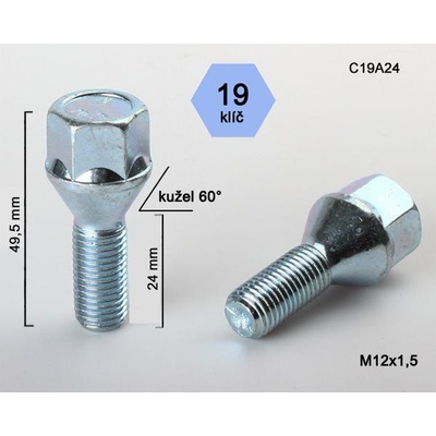 Kolové šrouby M12x1,5x24 mm s kuželovou dosedací plochou, typ C17A47 pro litá i plechová kola na přívěsy za osobní vozidla a Nissan Micra (2003-), Note, Kubistar, Renault...