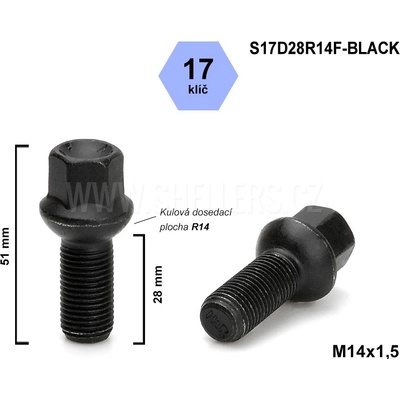 Kolové šrouby M14x1,5x28 mm s kulovou dosedací plochou R14 typ S17D28R14F-BLACK pro originální litá i plechová kola MERCEDES BENZ. (Pozor, litá kola AMG a Mercedes ML, S, CL,...