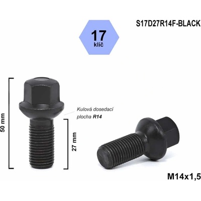 Kolové šrouby M14x1,5x27 mm s kulovou dosedací plochou R14 na originální litá i plechová kola Mercedes Benz S17D27R14F-BLACK. Pozor! Není určen pro litá kola AMG a Mercedes E...