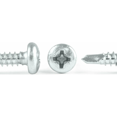 Samořezný šroub do plechu s TEX špičkou (vrtáčkem). Délka: 38 mm Průměr: 4,2 mm Povrchová úprava: pozink Norma DIN: 7504N Hlava: půlkulatá hlava Phillips